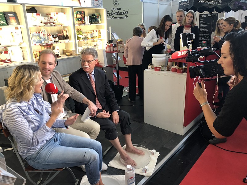 Gemeinsame Fußbaderunde am Messestand: Monica Ivancan und Dr. Peter Jentschura regenerieren in MeineBase während der Redakteur der Bunte beide interviewt.