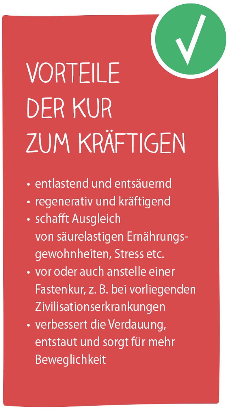 Strenge Fastenkuren oder Diäten machen meist weder glücklich, noch bringen sie den erwünschten Erfolg. Unser 4-Wochen-Kurkonzept besteht aus drei Schritten und lässt sich wunderbar in den Alltag integrieren: