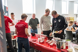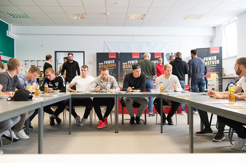 Chefcoach Möhlmann bedankte sich nach dem Vortrag im Namen der gesamten Mannschaft, die die Veranstaltung mit vielen neu gewonnenen Eindrücken zum Nachmittagstrainig verließ. Schon am Abend wolle die Mannschaft die ersten Anwendungen zum Entsäuern und Regenerieren nach dem Sport ausprobieren. Neben Informationen gab es für die Spieler TischleinDeckDich mit reichlich frischem Gemüse und MorgenStund‘ als Nachtisch zubereitet zum Probieren. Zum Schluss wurde das gesamte Team mit allen wichtigen Jentschura Produkten „eingekleidet“. Durch die langjährige Kooperation zwischen dem SCP und P. Jentschura wird deutlich, dass sich der Verein sehr zu Herzen nimmt, dass sportlicher Erfolg und eine ausgeglichene Säure-Basen-Balance stets Hand in Hand gehen.