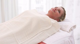 4. Darüber kann noch eine Wolldecke aufgelegt werden. Die Wolldecke kann auch vorher unter dem Wickeltuch auf der Liege platziert werden. Dann wird diese ebenfalls eingeschlagen und dient als warmes Außentuch für das KörperwickelTuch.